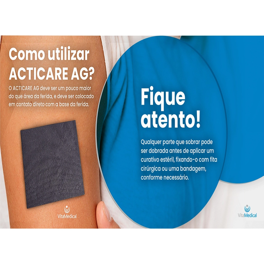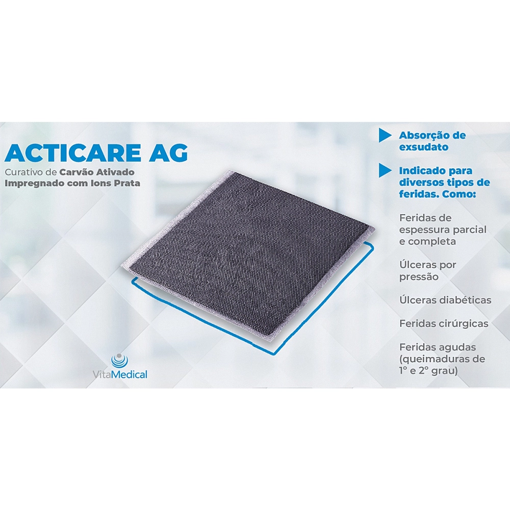 - Acticare AG é uma cobertura não adesiva, estéril, composto de carvão ativado impregnado com prata que pode ser recortável para uma aplicação mais eficiente e completa da melhor forma necessária que se adapte a lesão.