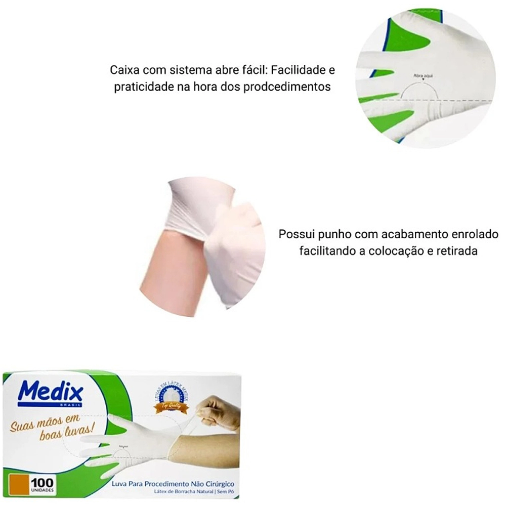 As luvas de látex sem pó da Medix são confeccionadas com látex de borracha 100% natural, oferecendo proteção e conforto em procedimentos não cirúrgicos. São ambidestras, descartáveis, de uso único e com superfície lisa, garantindo uma barreira eficiente contra contaminações. Possuem punho com acabamento enrolado para facilitar a colocação e a remoção, e são ideais para ambientes de trabalho que demandam segurança e higiene.