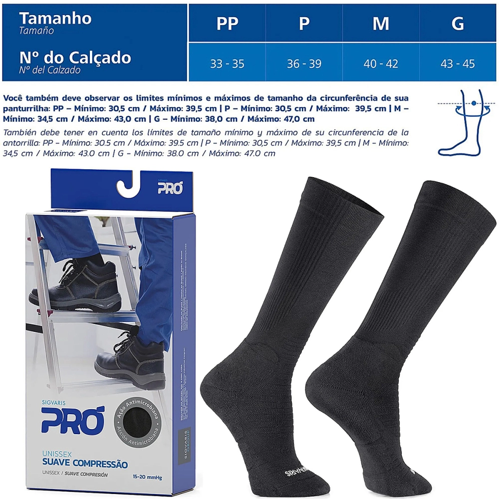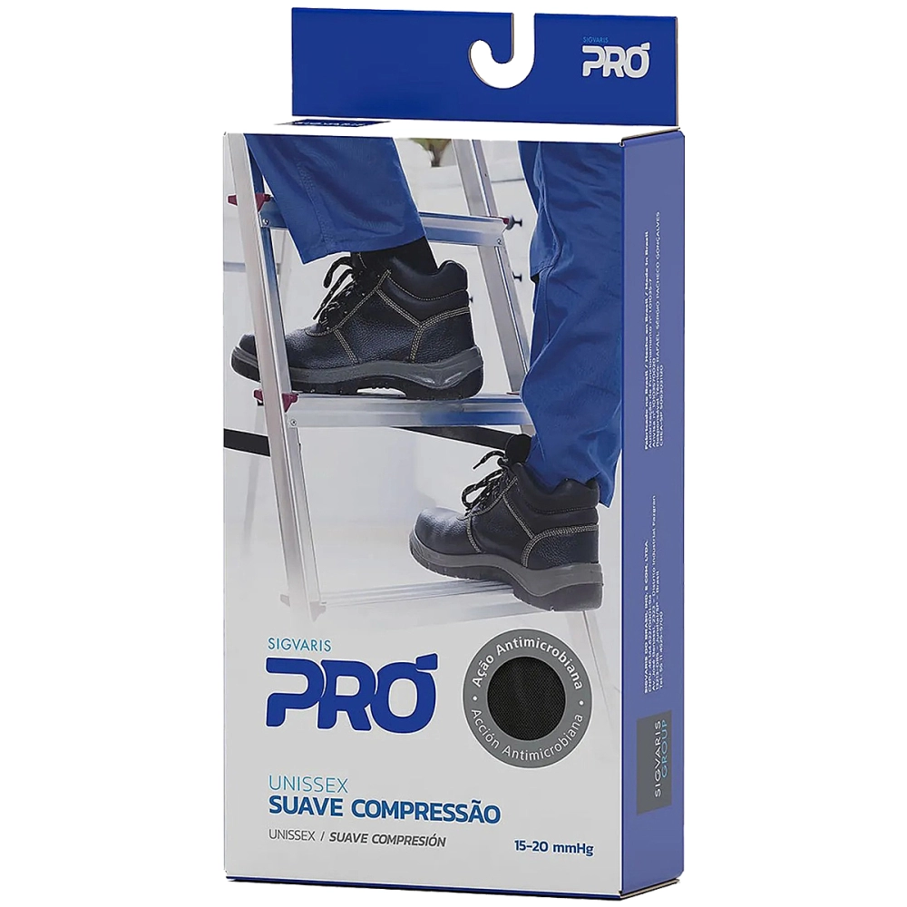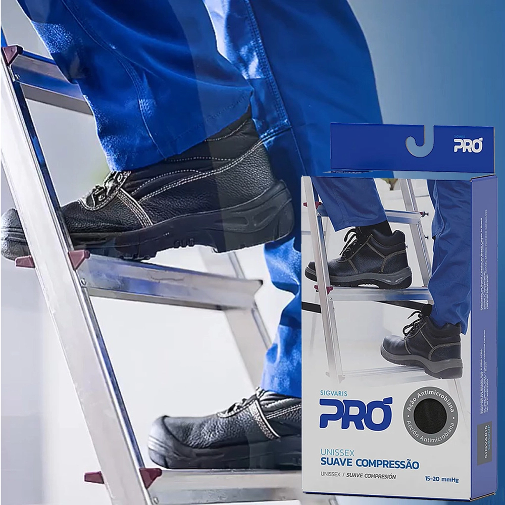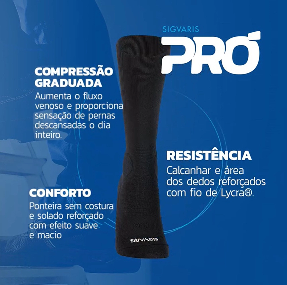 SIGVARIS PRÓ é uma meia confeccionada com poliamida, elastano e algodão (materiais que facilitam a transferência da umidade da pele), promove a saúde das pernas e alivia sintomas como: dor e cansaço nas pernas, inchaço nos pés e tornozelos. É o produto ideal para uso diário, reforçado e com design moderno.